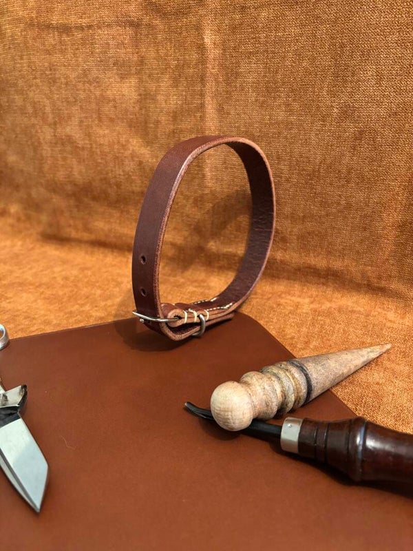 Collier simple en cuir marron de la Tannerie Radermecker. Finition des tranches au Tokonole pour un aspect naturel. Fil de couleur crème. Sans doublure.