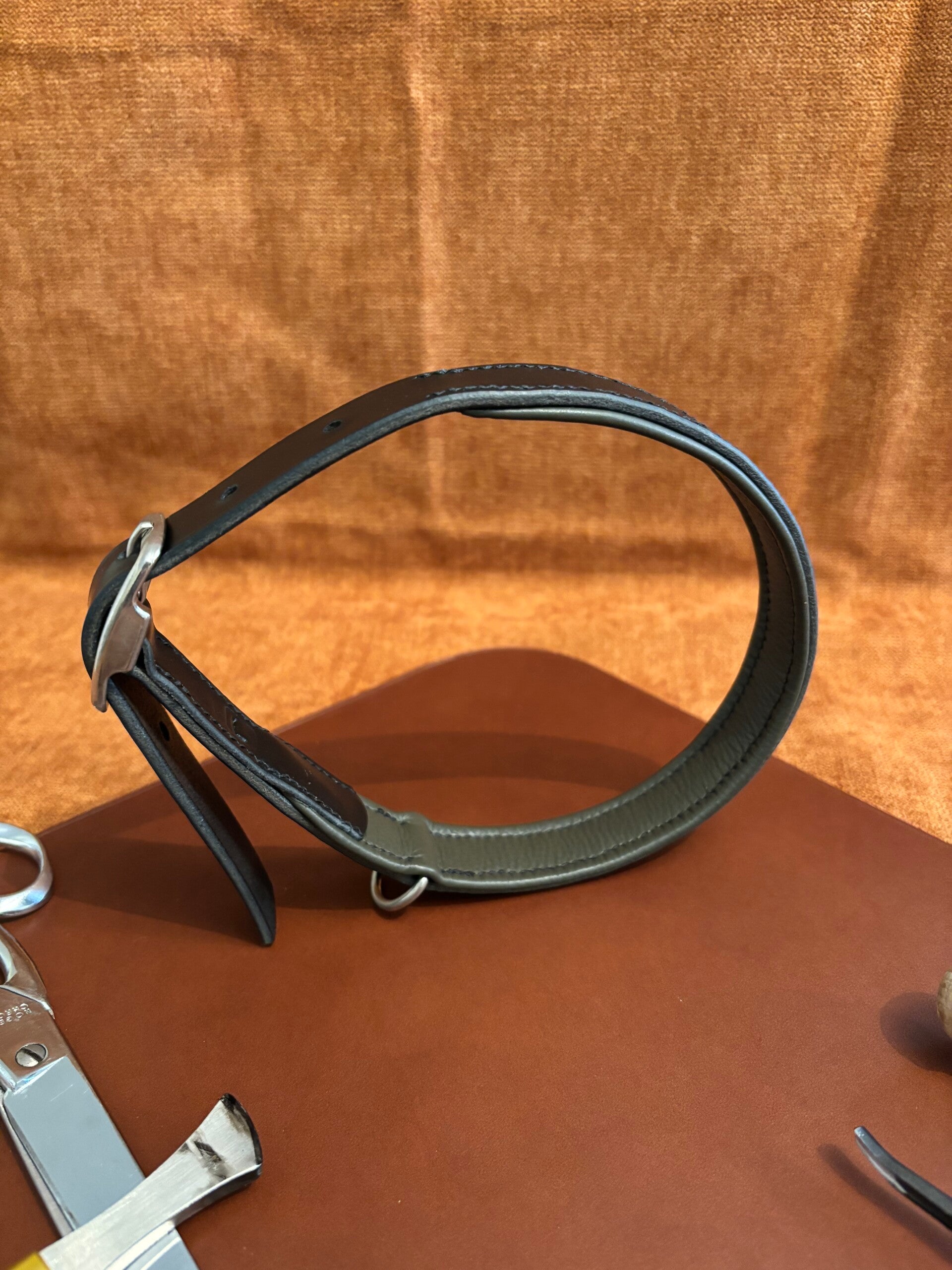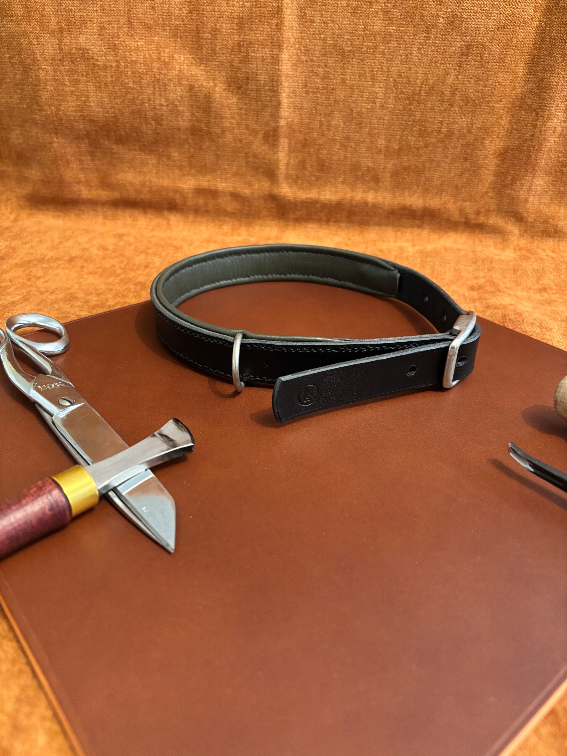Collier doublé en cuir de collet noir de la Tannerie Sovos (100% français). Finition des tranches au Tokonole pour un aspect naturel. Doublure en veau de couleur kaki. Fil de couleur noire.
